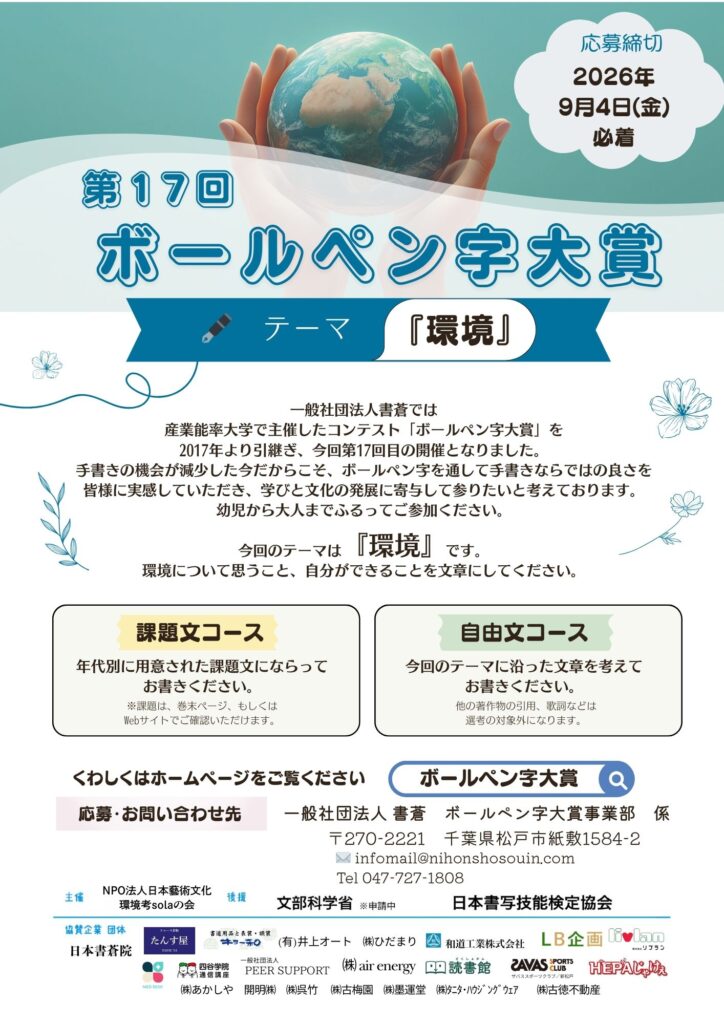 手書きの機会が減少した今だからこそ、ボールペン字を通して手書きならではの良さを実感していただき、学びと文化の発展に寄与したいと考えています。今回のテーマは、「環境」です。